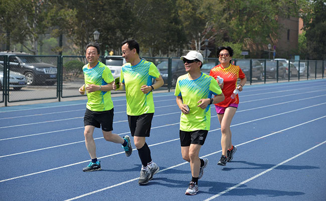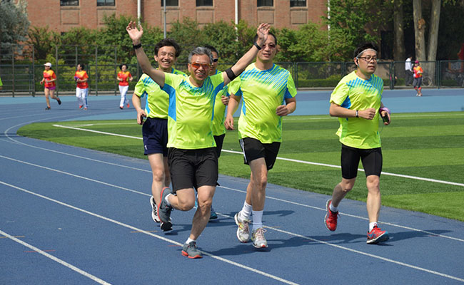 在靛蓝色的跑道上,有的校友本就是马拉松爱好者,一瓶水一双跑鞋,踏着稳健的步伐在阳光下轻松跑了30圈,赢得大家的由衷赞叹。有的虽未经过专门练习,但体育锻炼的传统从未丢下,10圈跑下来也轻松如常。很多校友久结伴健走,边走边谈,漫步重温曾经的校园时光。