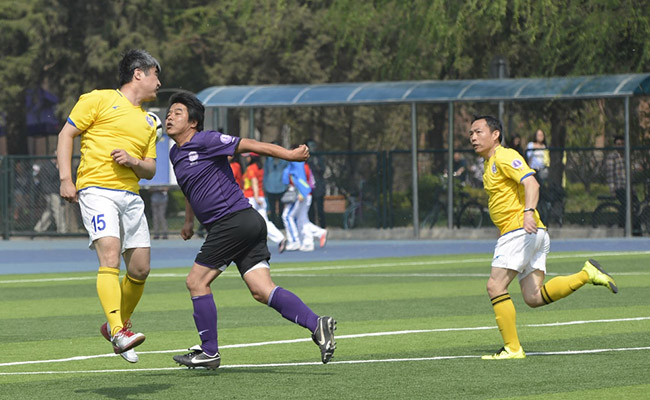 足球联谊赛由身穿紫色队服的“81联队”对身穿黄色队服的“81热汽”队。“81联队”由各系代表联合组成,“81热汽”队由热能系和汽车系校友组成。20余名队员当年曾在西操挥洒汗水、纵横球场,如今已两鬓染霜,年龄相加过千岁,所以戏称为“千岁球赛”。