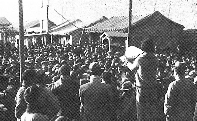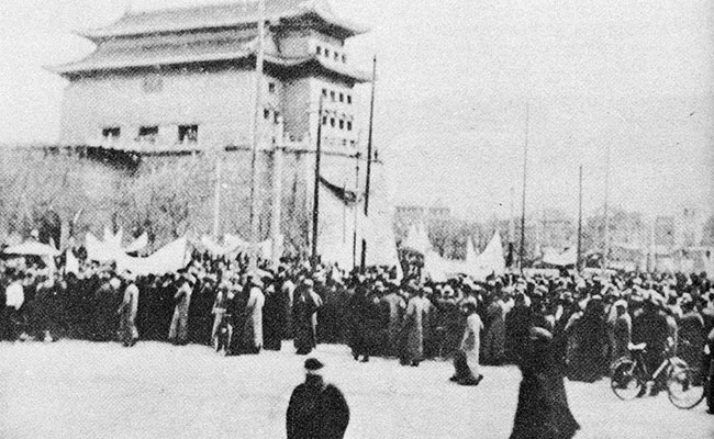 在天桥广场,一万多学生和两万多市民举行市民大会。广场上旗帜翻飞,口号震天。“打倒日本帝国主义!”“打倒汉奸卖国贼!”“反对成立冀察政务委员会!”的口号声此起彼伏,经久不息。