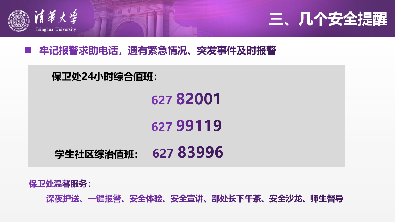 通过此次线上线下组合式安全教育培训,同学们加强了对校园安全、防诈骗、住宿管理、垃圾分类、传染疾病、消防设施等涉及校园和自身安全的知识认识,不仅在人身、财产安全方面提高了防范意识,还有助于保持健康向上的心理状态、提高抵御风险的能力,培训也为构建平安清华、健康清华奠定了坚实基础。