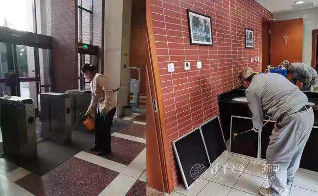 物业工作人员在逸夫馆、蒙民伟楼每天定时进行消毒清洁
