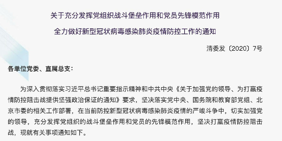 学校发布延期返校通知,并通过二级党委和基层党支部迅速完成了对全体教职工和学生的情况摸排,与仍在湖北的师生保持密切联系,及时掌握最新情况;腾出3栋宿舍楼作为在校学生集中住宿健康观察点;在发布延期返校通知之前从武汉等地返校的35名同学全部安排集中住宿、进行健康观察,后勤部门和学生系统做好点对点服务保障,目前大部分同学已结束健康观察,没有人员出现身体不适的情况;学校成立专门工作组,“一人一册”“一人一组”地做好确诊人员及其家属和密切接触者的相关工作;取消留校学生除夕晚会等大型活动,暂停校园参观,暂停艺术博物馆、图书馆、体育馆开放,推迟本科艺术类招生专业考试;校医院加强发热门诊力量,完成病房改造,与学校3家附属医院建立了联动机制,为疫情诊疗提供有力保障;校内各食堂加强卫生管理,安排志愿者进行防疫宣传检查;校内所有楼宇和家属区每天定时消毒;加强所有校门和所有楼门值守,对入校人员和车辆加强管控,逐一查验证件、测量体温;在信息门户网站上开设“疫情防控专题”栏目,开通24小时热线和心理咨询服务热线,帮助师生及时了解疫情信息、缓解焦虑情绪;清华园街道和学校密切配合,完成10个社区共9913户的“地毯式”排查和“敲门行动”,发动群众、群防群治,建立街道、社区、楼门疫情防范三道防线,做到防疫、便民两不误。