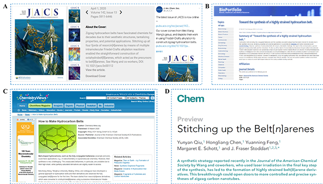 研究工作获得国际同行的好评,环带[8]芳烃的研究工作被《美国化学会志》杂志选为封面文章,并推送了论文(图7A)。ChemistryViews等(图7B和7C)报道了他们的研究。近日,诺贝尔化学奖获得者司徒塔特(Stoddart)教授在Chem(https://doi.org/10.1016/j.chempr.2020.03.019)(图7D)杂志上撰写文章,评价了J. Am. Chem. Soc.论文工作,认为他们合成策略巧妙(“ingenious idea”);标志着碳纳米管中含有高张力的最简构筑单元设计和合成方面的一个突破(“The present work, which constitutes the first synthesis and observation of the belt[8]arene derivatives, represents a breakthrough in designing and synthesizing the simplest building blocks with extreme high ring-strain energies that are present in CNTs.”);该突破可能打开了锯齿形碳纳米管更加可控和精准合成之门(“This breakthrough could open doors to moor controlled and precise synthesis of zigzag carbon nanotubes”);对环带烃研究领域作出了一个重要贡献(“have made a significant contribution to the field of hydrocarbon belts”)。