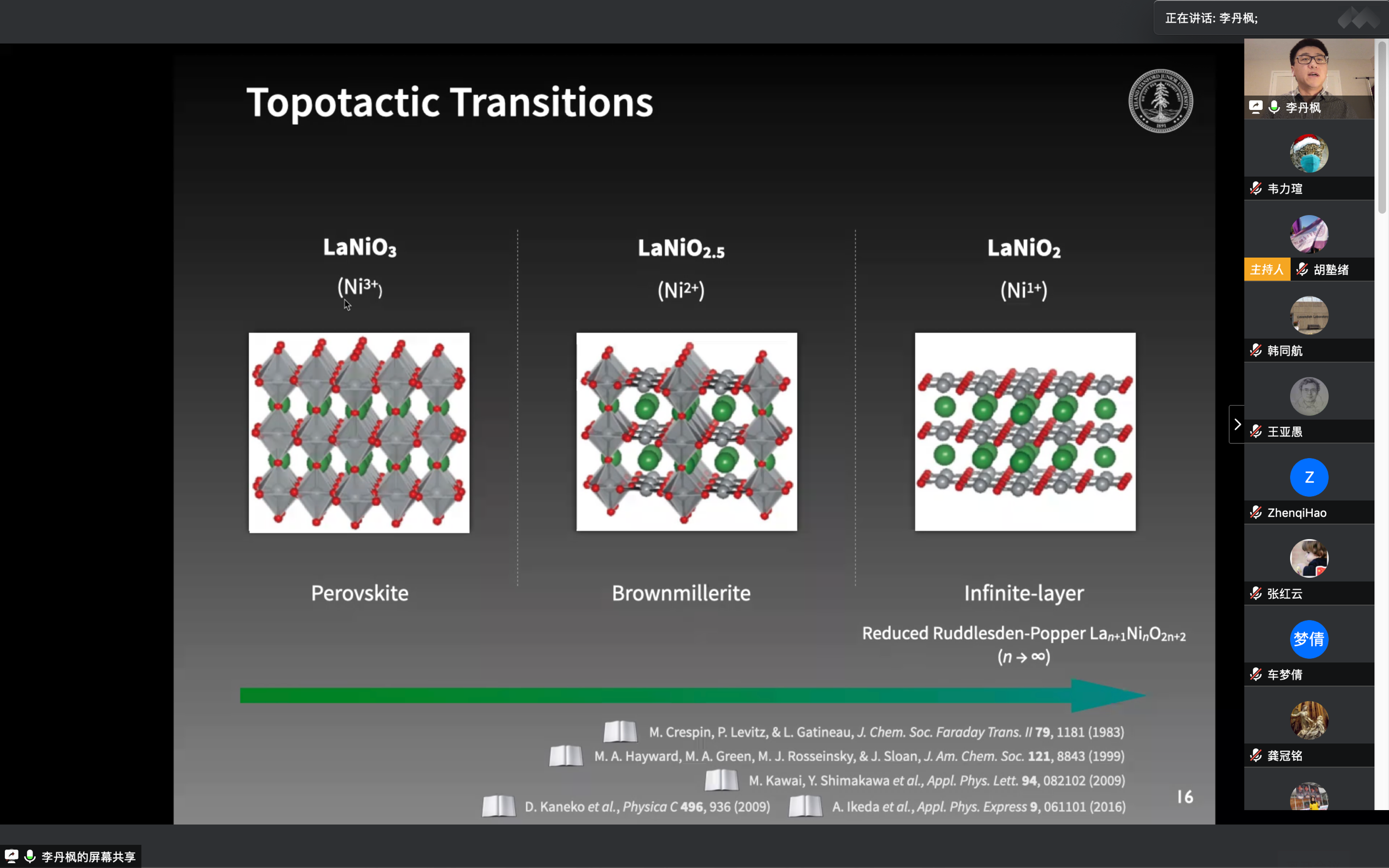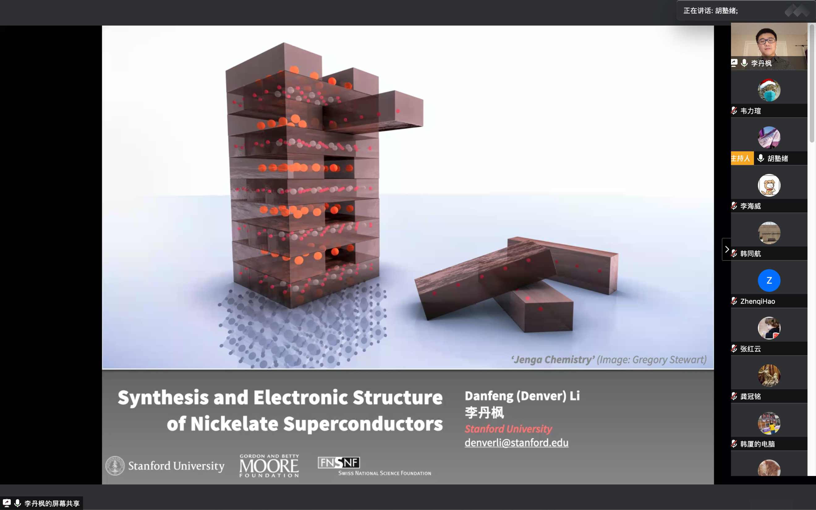 2019年,一种全新的非常规超导体——镍氧超导体被发现,成为近期超导领域的重要成果。李丹枫参与了镍氧超导材料的相关研究。在报告中,他首先对高温超导领域及镍氧化物体系的研究作了简单回顾,详细阐述了钕镍氧超导材料的制备、电子输运性质、材料电子结构。随后他介绍了利用X射线散射和光谱学研究电子结构的方法,以及项目近期相关的最新进展。李丹枫介绍说,拓扑化学法在镍氧化物超导材料的研究中起到重要作用,也将在未来的氧化物薄膜材料和异质结的制备中有更广阔的应用。