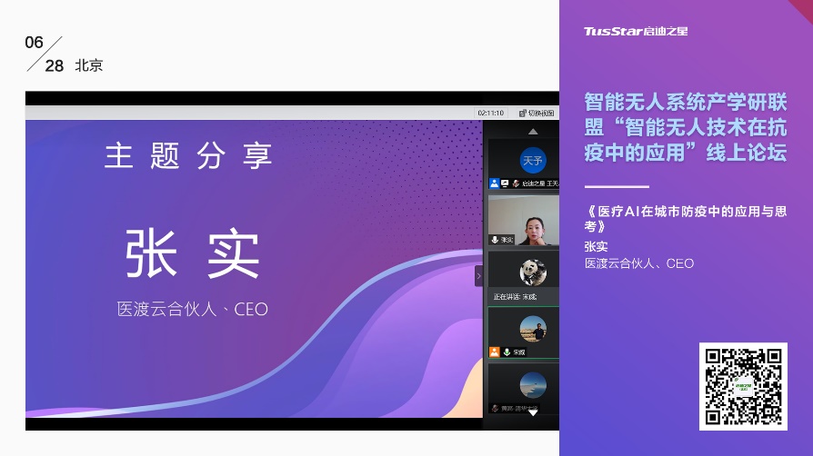 张实提出了医疗人工智能在城市防疫中的应用与思考。他表示,在防疫的关键时期,需要一种动态平衡的管理来支撑疫情防控和确保生活在复工复产复课后有序运行。“城市免疫平台”即通过多源异构数据合规治理、动态数据可视化和传染病预测模型构建等,分析真实现状、作出动态风险决策、模拟未来趋势,实现社会活动、经济发展与疫情管控的动态平衡,以此来促进城市大数据智能的合规有效开发,提升公共管理服务与决策能力,推动政通、惠民、兴业。