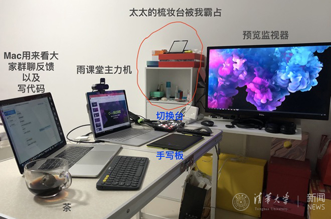 2月17日,春季学期的课程将正式开讲。目前,老师们正在加紧斟酌和修改教学方案;叶朝辉等老师已经提前和学生“见面”,在授课学生班级反复进行网络授课测试,修正直播方案;不少老师已经在家里或办公室觅得一方书香园地,搭建好直播授课所需的设备。