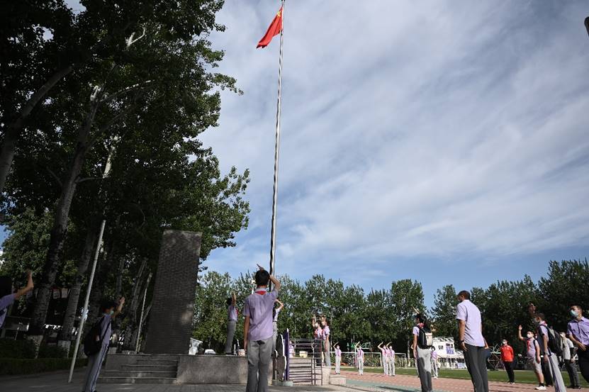 在成志大道上,学校举行了复学第一天的升国旗仪式。师生立定站好,致敬国旗,祝福伟大祖国。