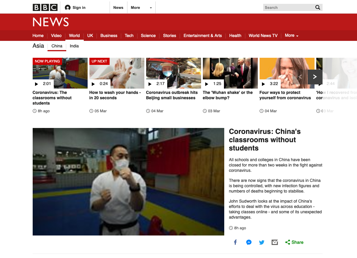 3月初,英国BBC对体育部教师冯宏鹏任教的本科三年级女生空手道线上体育课进行了采访报道。医学院三年级学生沈相宜说,老师们经常通过微信来答疑解惑,教学效率感觉未受太多影响。