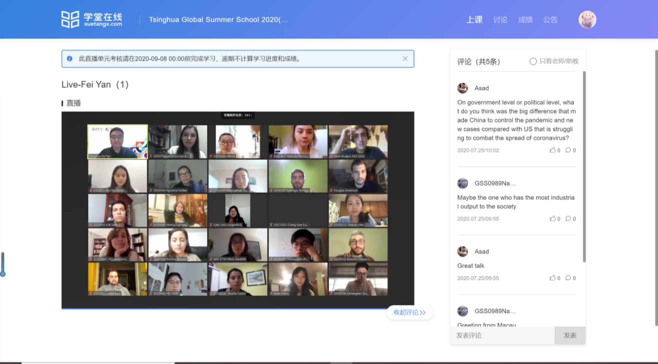 在进行课程设计的过程中,暑校策划团队与学术支持单位以及学堂在线等技术部门进行反复研讨,思考如何打破时间与空间多重界限,有效组织云端课堂,如何确保师生充分互动、鼓励学生合作学习。为确保授课效果,暑校在蒙民伟多功能厅搭建了现场演播室,并通过现场投屏的方式,保证主讲教师与学生的互动性,让虚拟教室体现出一定的现场感。另外,考虑到学生时差、网络状况等因素,暑校还在学堂在线搭建了在线演播室。学生通过给定的链接,既可以看到各种资源的现场直播,也可以随时观看回放。这种线上授课与学堂在线平台等多平台直播的形式,突破了地域、时间、人数和上课形式的限制,增加了学生参与度,减少了对上课形式的限制。