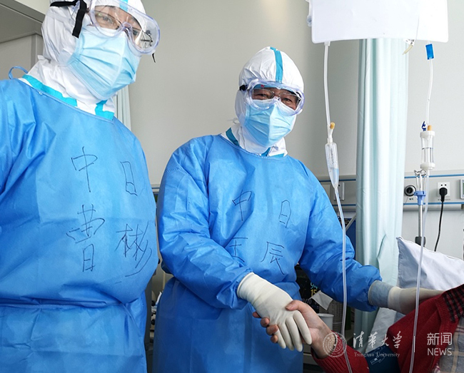 王辰(右)、曹彬身着防护服与新冠肺炎病人握手(图片来源:中日友好医院)
