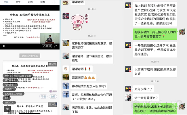 讲座结束后,参与雨课堂直播听讲的武汉大学老师们也纷纷点赞,表示“非常精彩,收获很大”:土木建筑工程学院万臻老师分享了对“以学生为中心”的看法和对线上教学优势的体会,“我喜欢弹幕,喜欢学生在我讲述过程中随时发送的信息。学生们也特别开心老师能关注到他,针对他的问题有及时反馈。这是实体课堂很难做到的。” 基础医学院何春燕老师则对雨课堂很感兴趣,本次讲座让她对利用雨课堂了解学生学习情况、实现线上线下实质等效有了更深刻的认识,“雨课堂的整合功能十分强大,利用雨课堂设计好课前、课中、课后内容,对实现高质量教学十分有帮助。”