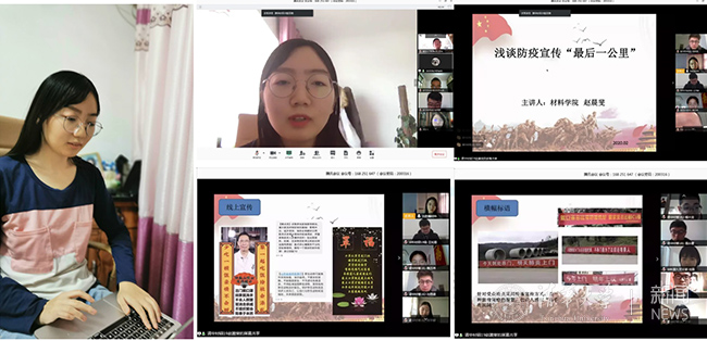 材料学院组织了“从我做起,同心战‘疫’”系列云上学术讲座,邀请了伍晖、王炜鹏、文永正等多名教师举办学术讲座。截至目前,材料学院云上系列讲座已开展9期,参与师生1000余人,不仅保证了科研交流活动持续进行,也督促了研究生同学提高学习与科研成效。