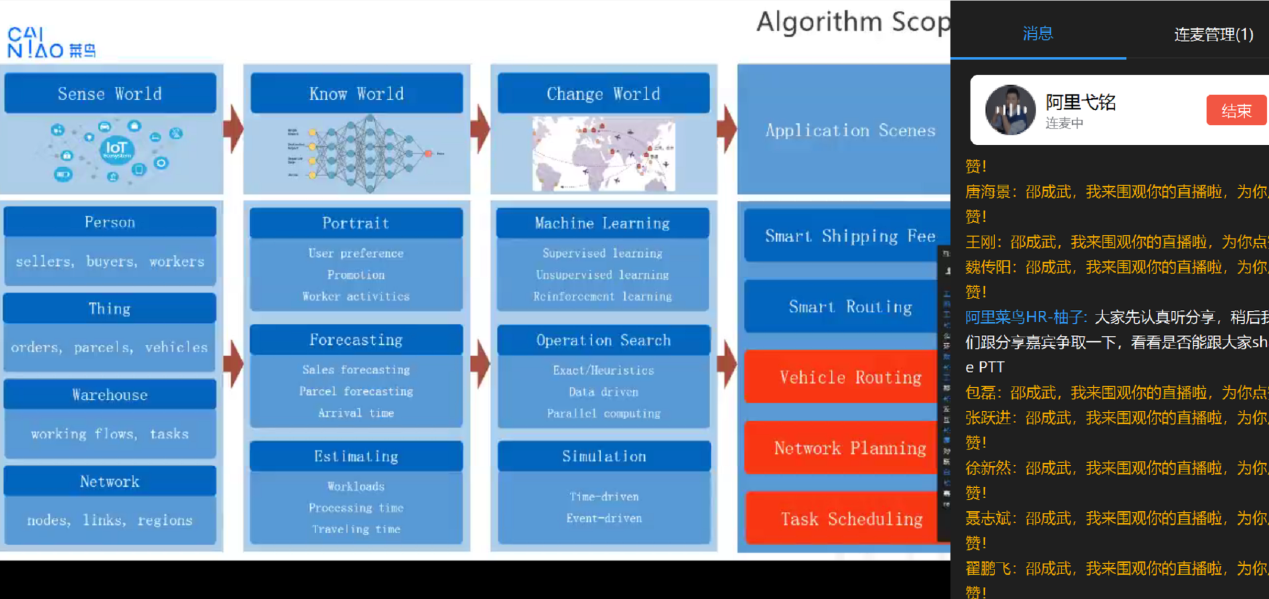 胡浩源是阿里巴巴集团的P9级资深专家,负责人工智能相关工作。他介绍了目前菜鸟物流中一些主要的算法技术课题,并在技术细节上进行了分析与补充。胡浩源分享了菜鸟的第一个自主研发的通用路由平台(VRP)、移动网页加速器(MIP)的形成过程、算法通用性与效果,以及机器学习与物流的融合路径。他还介绍了关于快递切箱、箱型设计、销量预测和快递调度方面的技术。