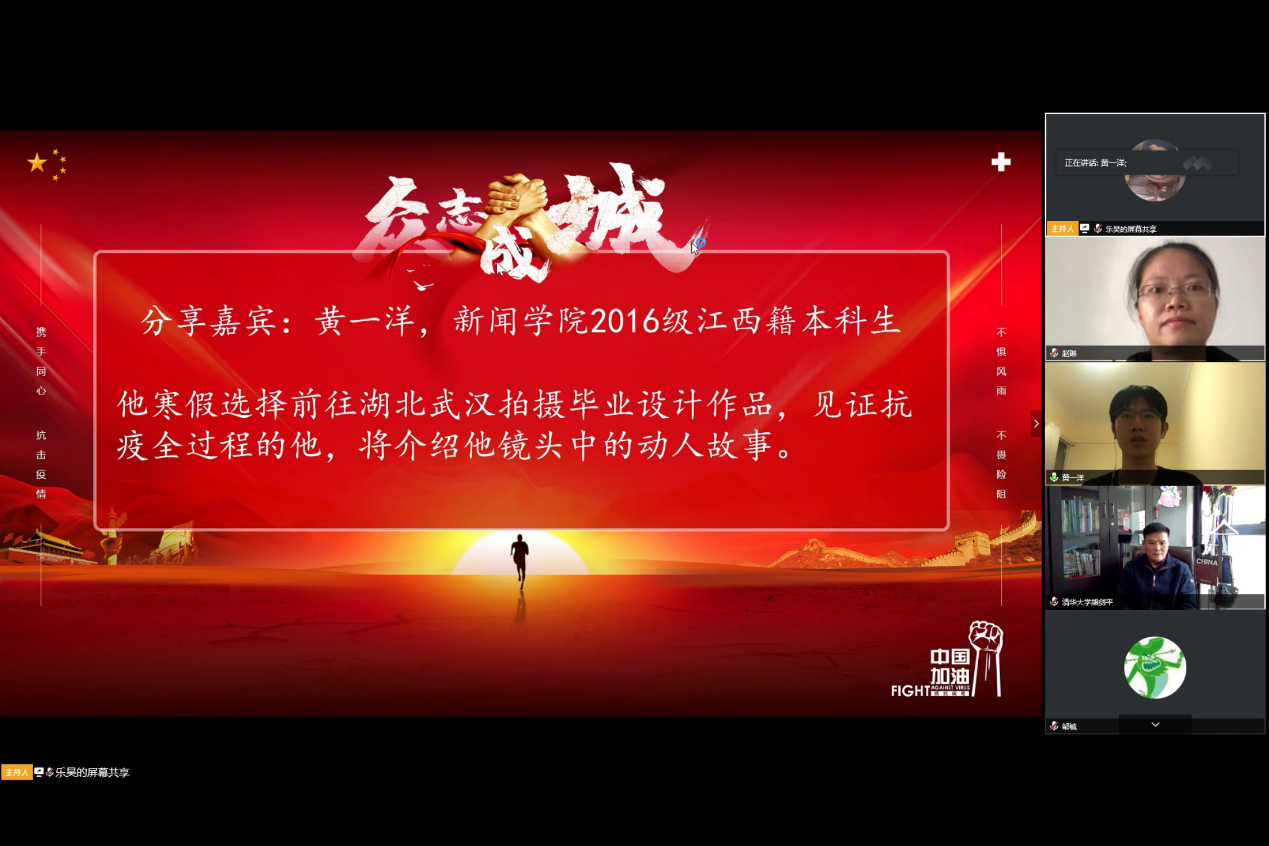 新闻学院2016级江西籍本科生黄一洋因拍摄毕业设计作品而意外滞留武汉。他的拍摄对象是一名热心志愿者,在政府希望征用自家酒店时,努力说服了家人,将酒店改造为隔离区。在武汉的这四个多月里,他看到了武汉从“生病”到逐渐恢复的过程,也认识到只有团结一致、共克时艰,才能真正战胜疫情。