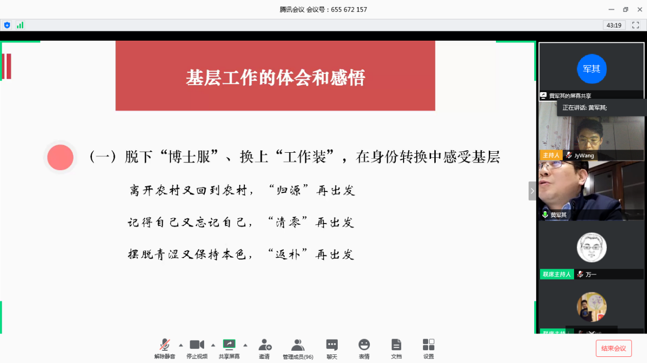 黄军其首先讲述了他在基层工作多年的体会与感悟。他谈到,刚到基层工作时,需要尽快转变身份进入工作状态,脱下博士服,换上工作装,褪去身上的“书生气”,乐闻基层的“泥土香”,脚踏实地、全心全意地为人民服务。他提醒大家,由于基层工作条件有些艰苦,同学们初到基层工作时可能会出现难适应、难安心和难深入的情况,这时更需要坚守初心,把基本功练扎实,实实在在地为老百姓们做事。