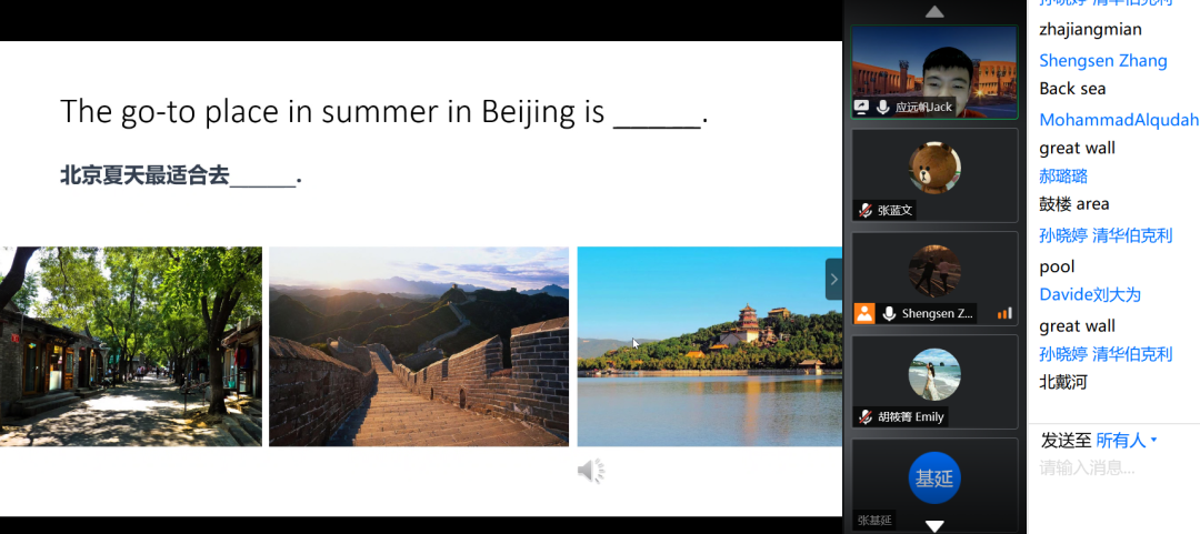 本次活动由人文学院2017级硕士生应远帆担任中文导师,他从北京美景美食和语言文化入手,带领身处世界各地的国际生同学云游北京。随后,中文导师引导国际生交流北京的生活记忆,并帮助他们理解有趣的北京话,唤醒了国际生同学们许多对北京、对校园的回忆,也鼓励大家相互交流防控隔离期间的体验与期待,中外同学共同度过了一段难忘的“云上汉语说”时光。