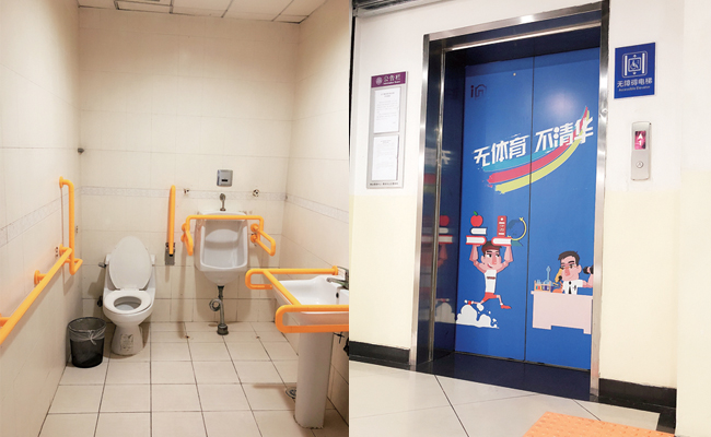 教学楼无障碍卫生间(左)和无障碍标识提示(右)
