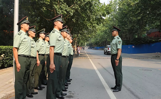 陆军防化学院参训官兵即将抵达紫荆路,军训总指挥、校党委常委、副校长王希勤教授,副总指挥关兆东、熊剑平、白本锋和昝青峰老师等军训指挥部领导老师到场迎接。