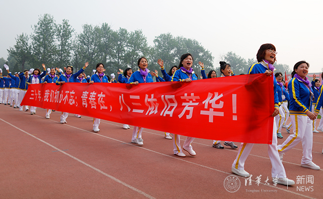 与此同时,东大操场北侧马路对面的“红场”已是人潮涌动,毕业10周年、20周年、30周年、40周年的校友们身着蓝黄相间、写有“清华”字样的统一服装,扶老携幼,在这里列队排练。开幕式前,邱勇、陈旭也来到这些秩年校友方阵中,与他们握手、拥抱、合影,共话清华体育精神,现场气氛十分热烈。随后,邱勇、陈旭步入东大操场,在“无体育,不清华”的标牌前与毕业50周年的1968届校友方阵亲切合影。
