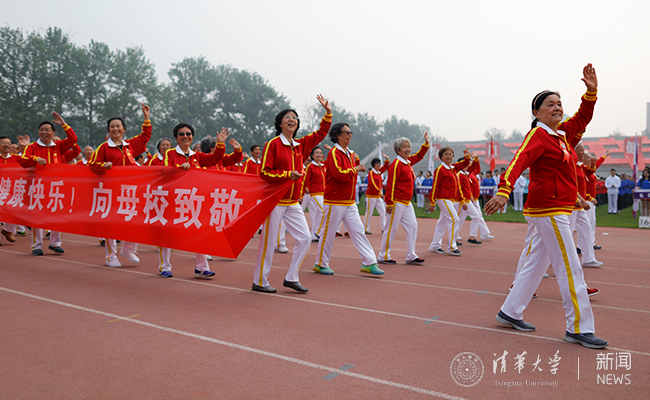 早上7:00,东大操场南侧的大屏幕上已经打出“清华正芳华”的校庆主题图,屏幕上的现场直播在开幕式中全程持续。东侧看台上,建筑学院师生利用废旧横幅组合成了“清华正芳华”的校庆口号,既体现了循环利用和可持续发展的设计理念,也营造了喜庆的校庆氛围。