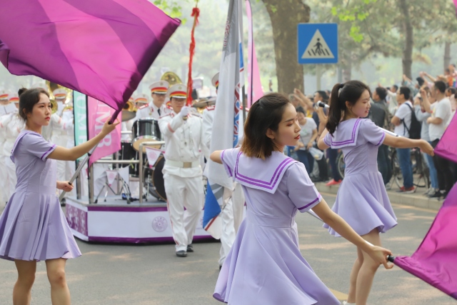 游园队伍整齐却不单调,旗队和军乐队节奏一致的步伐,啦啦操队、国标队青春活力的舞步,构成了校庆日园子里一道靓丽的风景线。