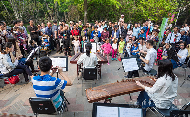 下半场先是“知音雅集”,由清华校友民乐团队员与学生艺术团民乐队成员合奏《牧民新歌》《战马奔腾》以及《山语·幻》,随后,校友民乐团队员奉上古筝、竹笛以及二胡独奏曲目。表演吸引了很多观众,他们拿着手机或是单反,有的照相,有的录影。还有一位老校友调转手机,尽力把手机往前伸,用手机底部的麦克风朝向现场录音。演出结束,观众掌声不绝。