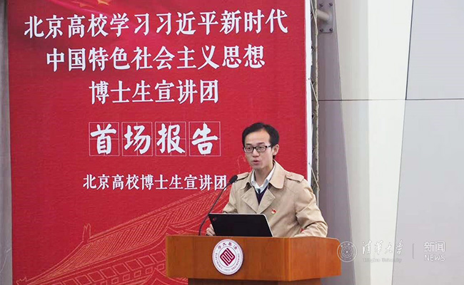 马克思主义学院2017级博士生李璎珞以“新时代,扬帆再起航;新青年,开启新征程”为题,将十九大的主题概括为“心、旗、路、梦”四字,随后从“新时代”“新理念”“新青年”三方面对“十九大”精神进行了独到的解读。在“新时代”方面重点讲述了从中共“八大”到“十九大”中国主要矛盾发生的三次变化,并结合亲身经历介绍了中国不平衡发展的现状;在“新理念”方面,详细解读了对“和谐发展构建生命共同体、和洽发展构建民族共同体、和平发展构建命运共同体”的独到见解;在“新青年”方面,号召清华学子做“有理想、有本领、有担当”的新青年,“到世界需要的地方去”。