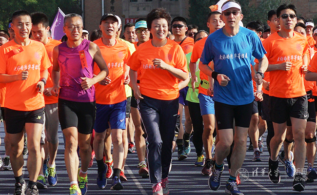 跑步过程中,陈旭前来看望大家。她说,以跑步的方式向母校献礼非常有意义,大家用自己的行动弘扬清华的体育传统,践行清华的体育精神。随后,陈旭加入了奔跑的队伍,用汗水与呐喊响应“为祖国健康工作五十年”的号召。