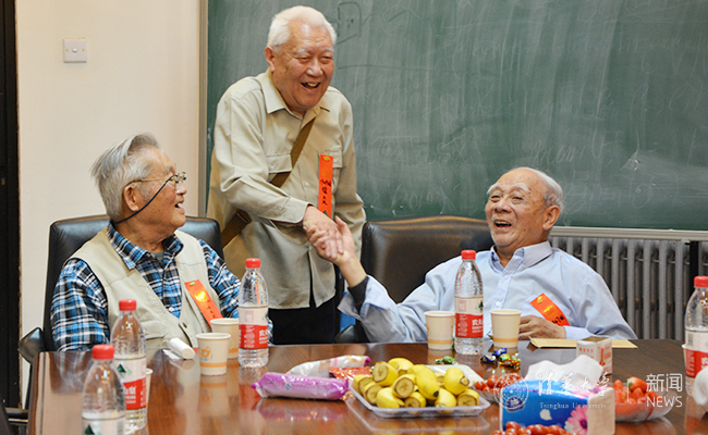 毕业50周年校友共同佩戴纪念章合影。杨帆