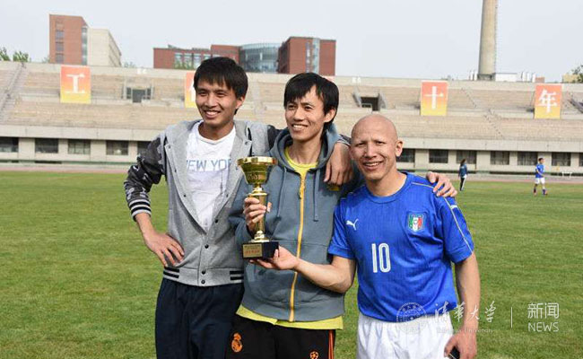 生命学院足球队夺冠后乃哥麦提·伊加提(右一)与同学合影。
