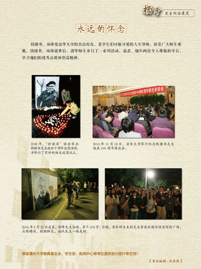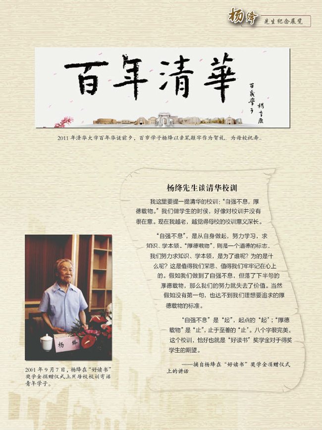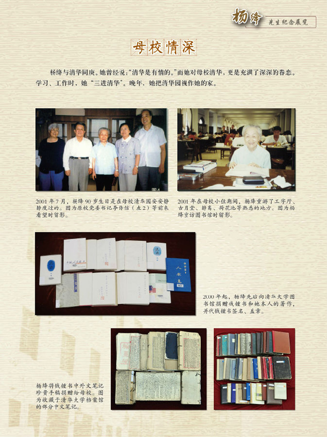 清华新闻网5月31日电 “杨绛先生纪念展览”5月31日在校史馆一楼大厅开幕。展览以文字、图片、实物、视频等多种形式,生动记述了杨绛先生作为中国当代著名作家、翻译家和学者的人生历程和创作成就,重点介绍了杨绛先生三次与清华结缘的往事和一生对清华的眷恋,反映了清华师生对钱钟书、杨绛两位老学长的深切爱戴和思念。