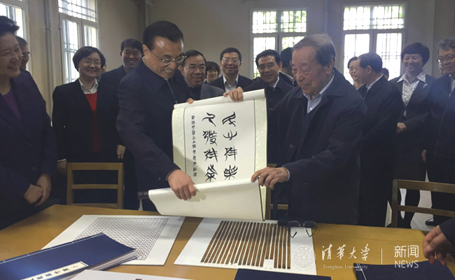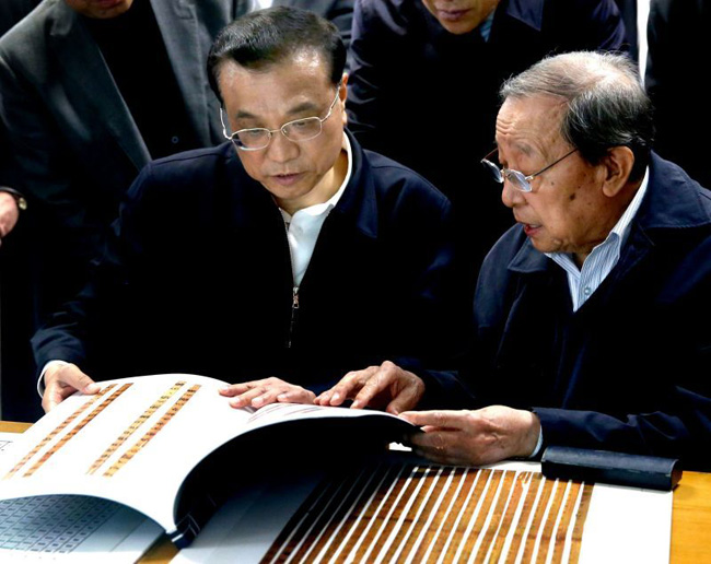 在竹简保存陈列室,李克强仔细察看了竹简藏品,并详细询问了竹简的年代、保存情况和研究情况。著名历史学家、古文字学家、出土文献研究与保护中心主任李学勤教授向总理汇报了清华简的整理工作,介绍了清华简的研究情况。李克强关切地询问研究团队的工作情况,对研究团队取得的成果表示祝贺。他鼓励大家继续努力做好清华简的整理、保护和研究工作,不断取得新的重要成果。