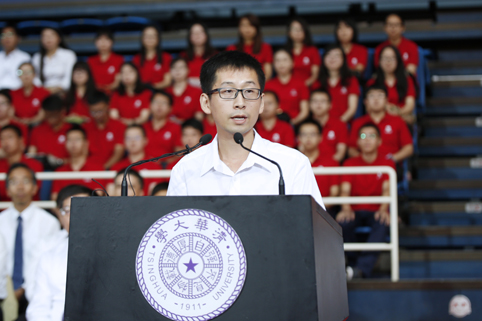 航天航空学院2015级直博生吕焱代表全体新生发言。他讲述了自己本科阶段接触科学研究、逐渐对学术产生浓厚兴趣的经历,谈到失败并不可怕,直面失败是对我们精神品质的最好历练,经历失败才能更好地享受成功。