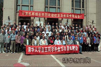 清华新闻网4月26日电(通讯员 尤晓慧4月25日上午,1965届自控系98位校友连同家属百余人,在主楼东阶梯教室举行了毕业50周年聚会,同时庆祝母校104岁华诞。校友们在计算机系门口合影留念的时候,校党委书记陈旭特地赶来参加。