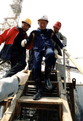 这是2000年4月,年近九旬的张光斗教授在三峡工地检查工程质量,他坚持下到施工仓面进行实地考察(资料照片)。 新华社发