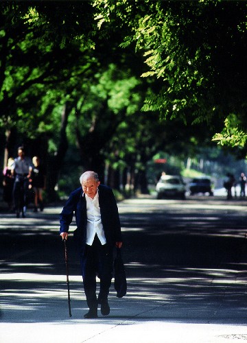这是年愈九旬的张光斗教授仍每天拄着拐杖到办公室工作(2003年7月摄)。 新华社发