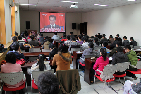 公管学院一层报告厅师生观看十八大直播现场。