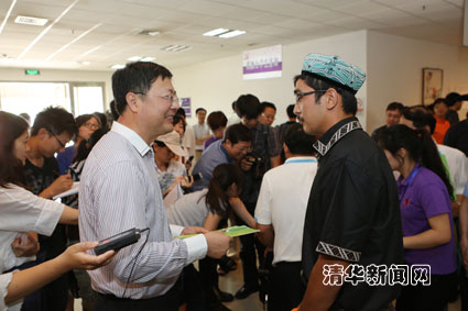 随后在“绿色通道”,陈吉宁校长与努尔艾力·麦麦提亲切交谈,陈吉宁握着他的手说:“清华就是你的家,来这里一定要好好学习,学校有很多措施能保证你们顺利就学,经济问题不用担心!”