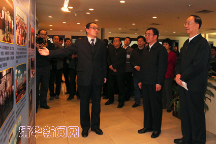 在介绍清华校训、校风形成过程的展板前,在老校长梅贻琦阐述“大学”、“大师”、“大楼”的语录前,在解放前夕毛主席为保护清华、燕京等学校所作的批示前,贺国强屡屡驻足,朗声念诵。