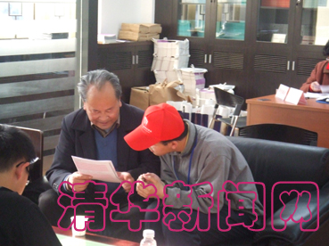 同方部校友总会附近集中了大部分志愿者,他们各司其职,或分装资料,或门前迎宾,或誊写校友胸花名条,或耐心地讲解校友调查问卷。