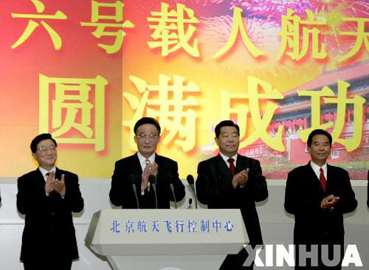 10月17日凌晨,神舟六号飞船成功返回地面。中共中央政治局常委吴邦国、贾庆林、黄菊、吴官正等在北京航天飞行控制中心观看飞船返回实况。吴邦国宣读中共中央、国务院、中央军委贺电。 新华社记者刘卫兵摄