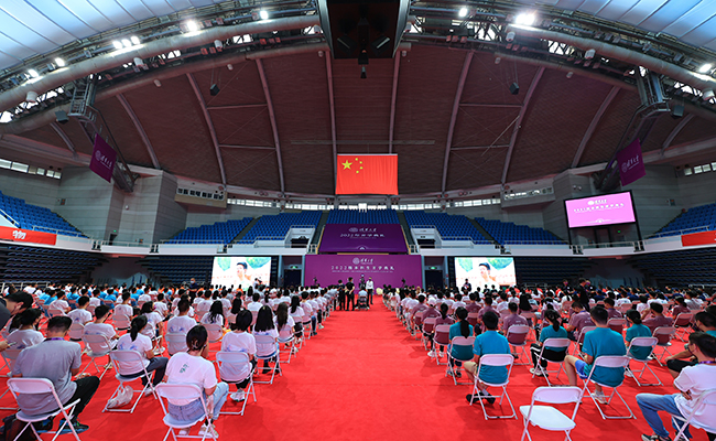 鉴于目前的疫情防控形势,本次开学典礼采用线上线下结合的方式举行,线下设置了24个会场,并通过雨课堂平台同步双语直播。近500名新生代表在综合体育馆主会场参加典礼,3000余名新生在分会场观看现场直播。
