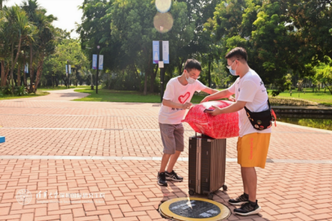 报到入口处,学院还为新生们准备了一次性口罩、免洗消毒凝胶、体温计、矿泉水等物资。工作人员和志愿者们细心帮助新生搬运行李。同学们乘坐学院摆渡车往返于报到点和宿舍,居住在校外公寓的新生们也乘坐着校园穿梭巴士,前往集悦城、云谷公寓和国际一期公寓。