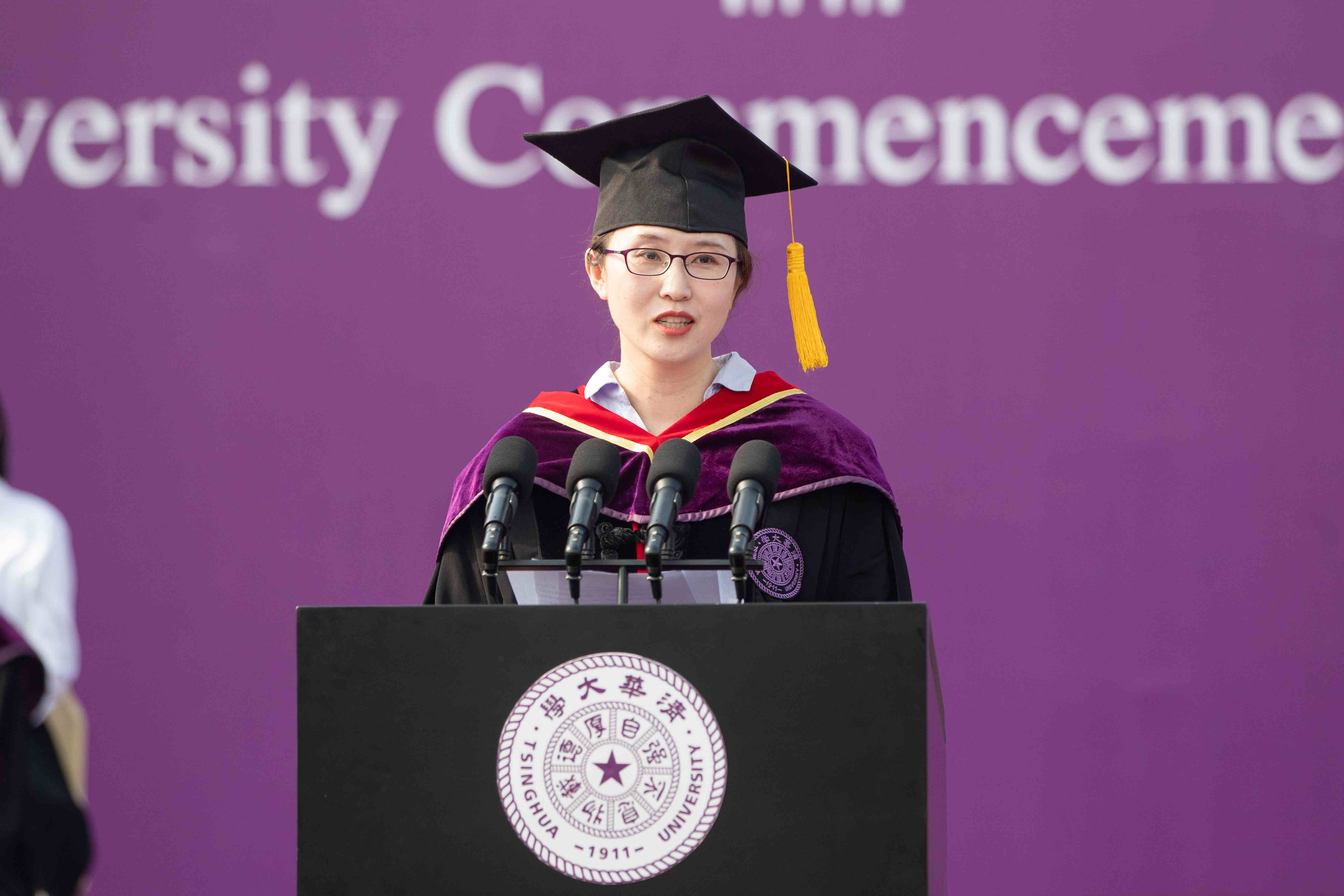 材料学院1999级校友、液流储能科技有限公司首席科学家、全国三八红旗手获得者王瑾作为校友代表发言。她分享了自己从清华毕业后出国深造、回国创业、主持建设国内首座盐酸基全钒液流电池储能系统电站的经历并谈到,不忘来时路,方知向何行。她仍记得大一参加入学活动时,校领导在讲话中强调的“清华人要将个人成长融入国家的前途,这是清华的光荣传统”。虽然当时还很懵懂,但自己从没有忘记理想和母校的嘱托。希望大家在展示自我、享受这个美好时代的同时,不要忘记身为清华人的使命。牢记“自强不息、厚德载物”的校训,将小我融入祖国的大我,担当起强国建设、民族复兴的重任。